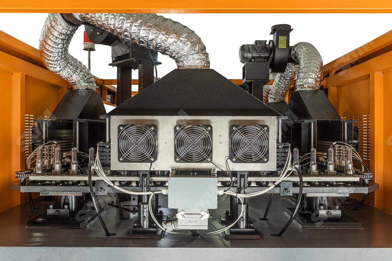Usando lâmpada infravermelha para penetrar no aquecimento da pré-forma, para que o estiramento da pré-forma seja mais uniforme, alta transparência; Equipado com placa de alumínio espelhado importado, aproveita ao máximo a energia térmica da lâmpada, encurta o tempo de aquecimento, reduz o consumo de energia e melhora a capacidade de produção. E cada camada de cada tubo pode ser ajustada separadamente a temperatura, de acordo com o ajuste do cliente para diferentes embriões de tubo para cima e para baixo, antes e depois. -