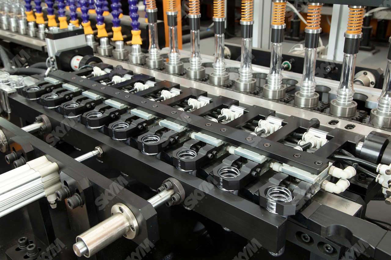 O dispositivo de cabeça de resfriamento e aquecimento desenvolvido independentemente pela empresa Sky Machine garante o resfriamento da cabeça de aquecimento fora da garrafa. Um canal de resfriamento é disposto sob a caixa de aquecimento. Quando a pré-forma é aquecida, o canal de resfriamento é usado para bloquear o calor do tubo de lâmpada. Há um sistema de ar frio sob o canal de resfriamento para resfriar a boca da garrafa e protegê-la da deformação. Água gelada para o molde, resfriamento rápido do molde, melhora a eficiência produtiva da máquina.